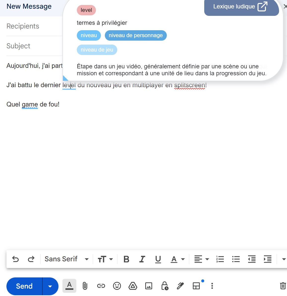 En temps réel, Lexique ludique repère les anglicismes et propose des alternatives francophones. Pour l’instant, il y a près de 200 termes et expressions répertoriés.