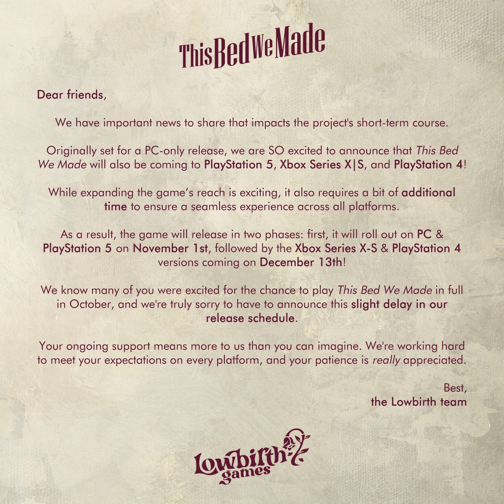 This Bed we made sera disponible sur PC et PlayStation 5 le 1er novembre 2023, et sur Xbox Series et PlayStation 4 le 13 décembre 2023.