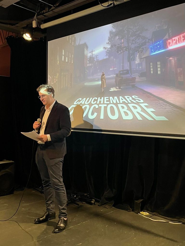 C’est ce nous a raconté hier Olivier au dévoilement de son prochain jeu, Cauchemars d’Octobre, qui était accompagné d’une projection du film Octobre de Pierre Falardeau, en compagnie du comédien et député Denis Trudel.